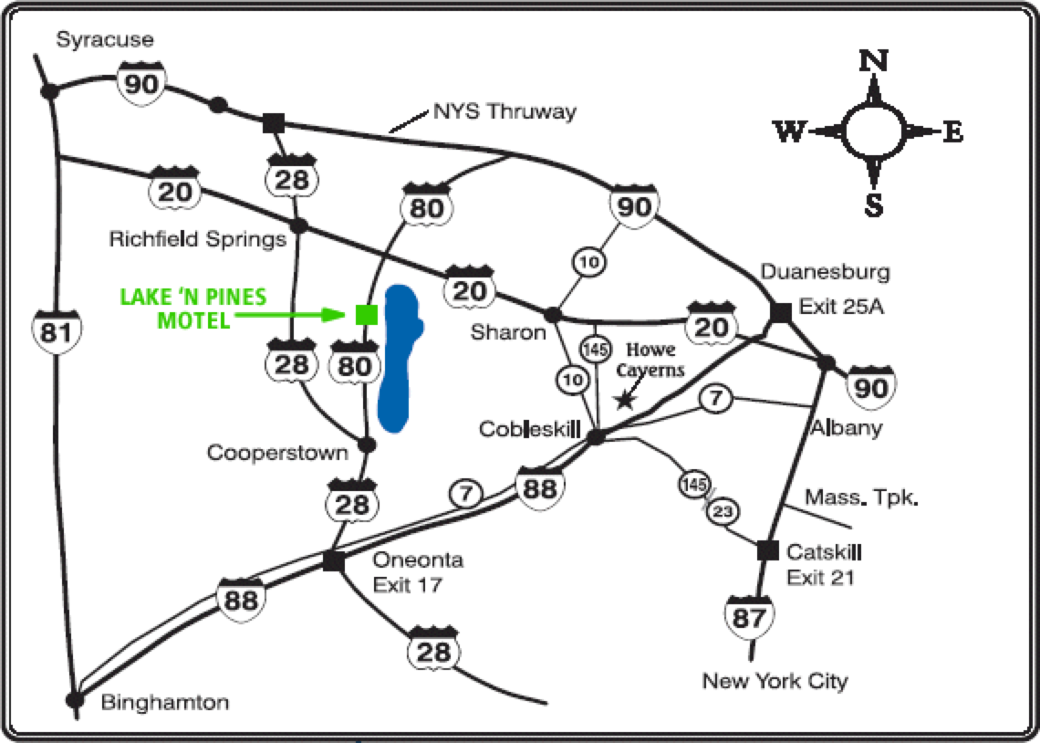 From Exit 30, Herkimer: Use Rt. 28 S. to Rt. 20 E. to Rt. 80 S.