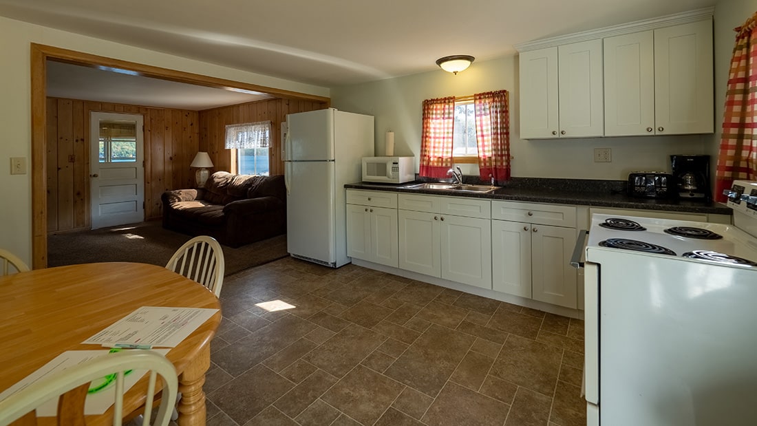 The cottage is situated all on 1 level and has a full kitchen, living room, enclosed sun porch, full bathroom and 2 bedrooms. The living room has a couch, loveseat, flat screen TV with HD Cable and an electric fireplace for those cooler months.