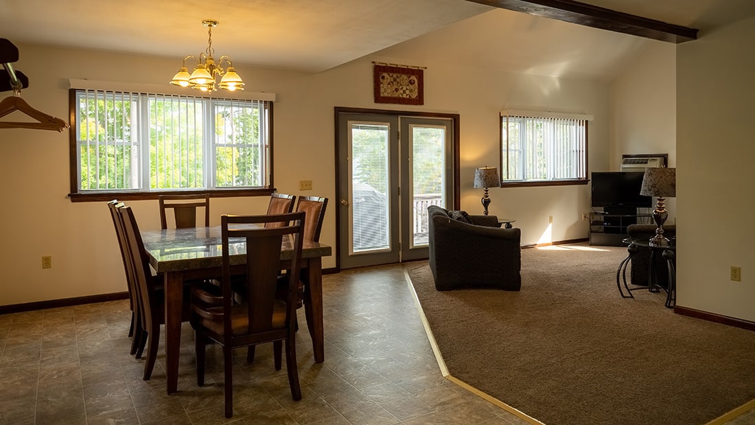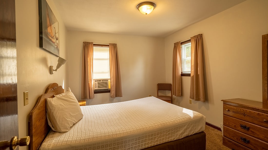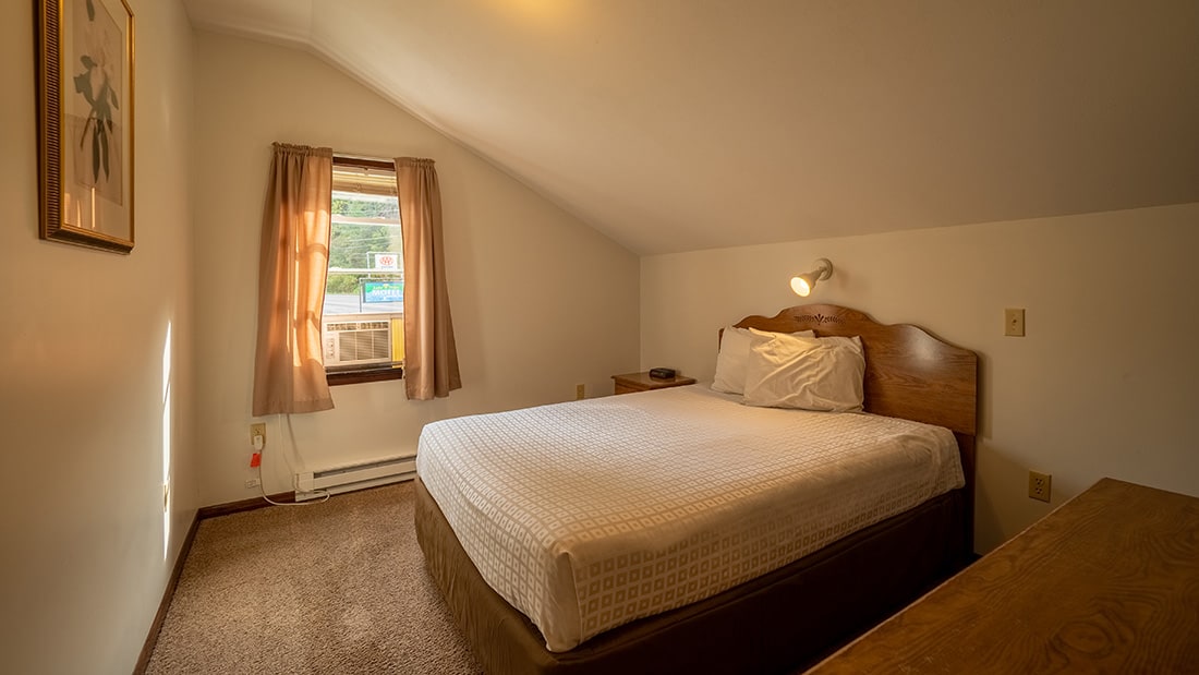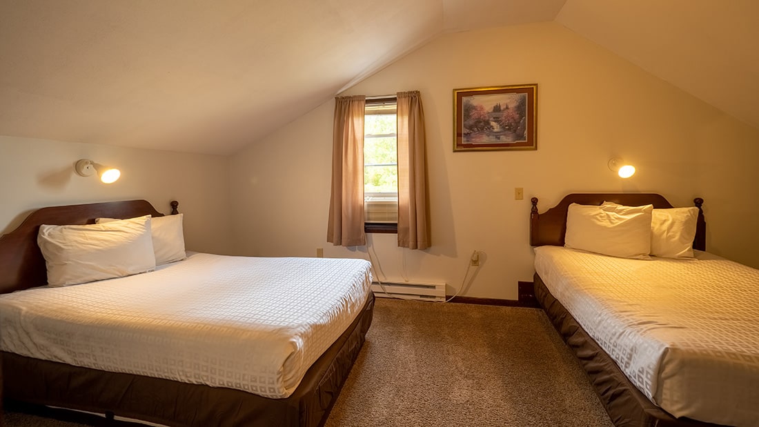 Our Modern White Cottage, #134, is located at the top of our property and features 3 bedrooms, 2 rooms with 1 Queen bed and 1 room with 2 double beds. This cottage is located the furthest from the lake but has stunning views of Otsego Lake.
