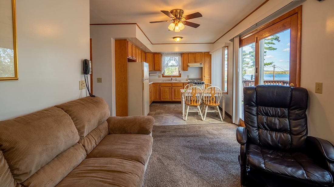 The suite is located all on 1 level and has a full kitchen, dining table, full bathroom, living room with a couch and leather recliner, flat screen TV with HD Cable and French doors leading out to the deck area.